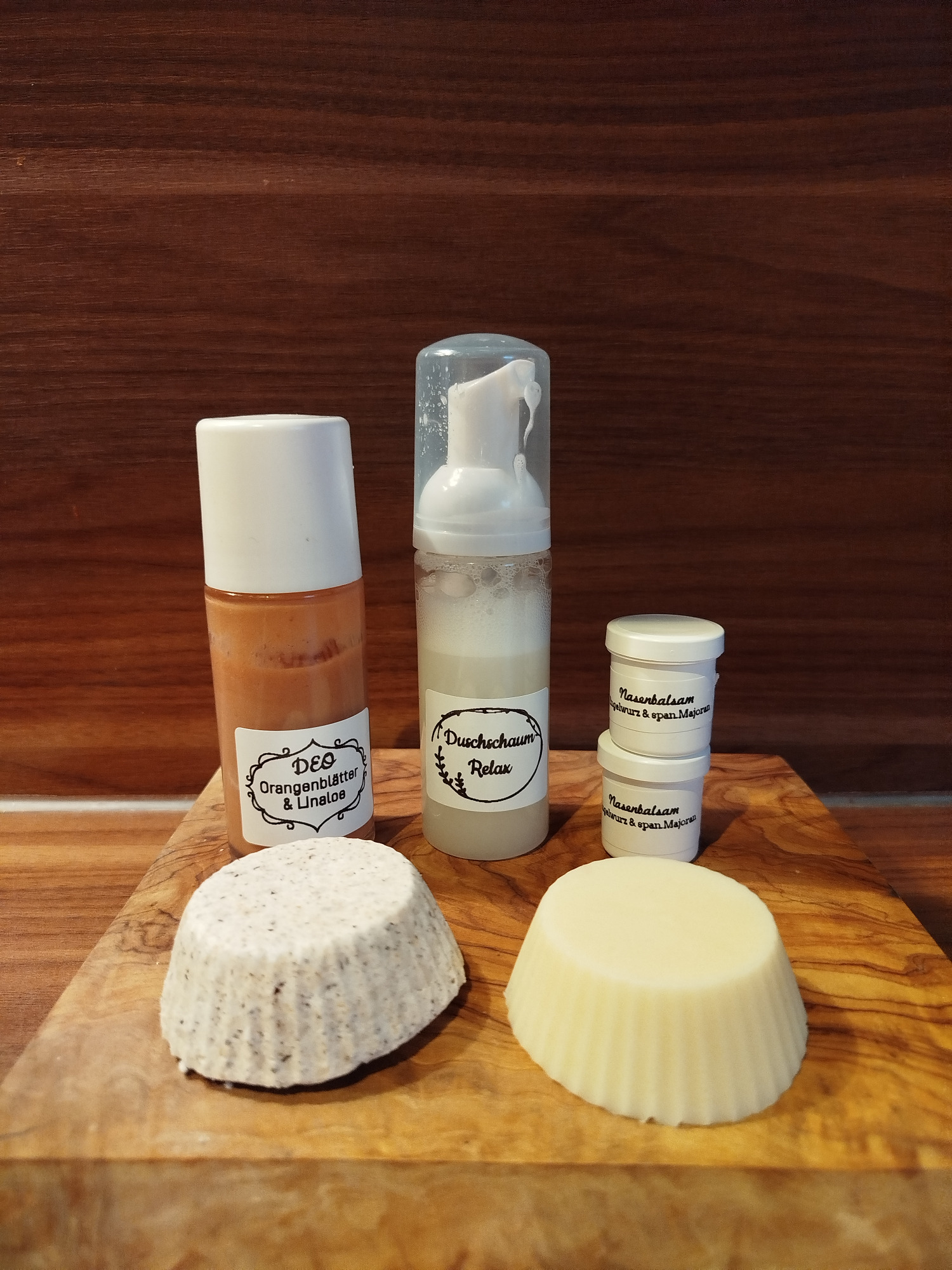 Aus natürlichen Zutaten wie pflanzlichen Ölen, Pflanzenwässern und ätherischen Ölen stellen wir gemeinsam 5 einfache Pflegeprodukte für natürlich gepflegte Haut her.